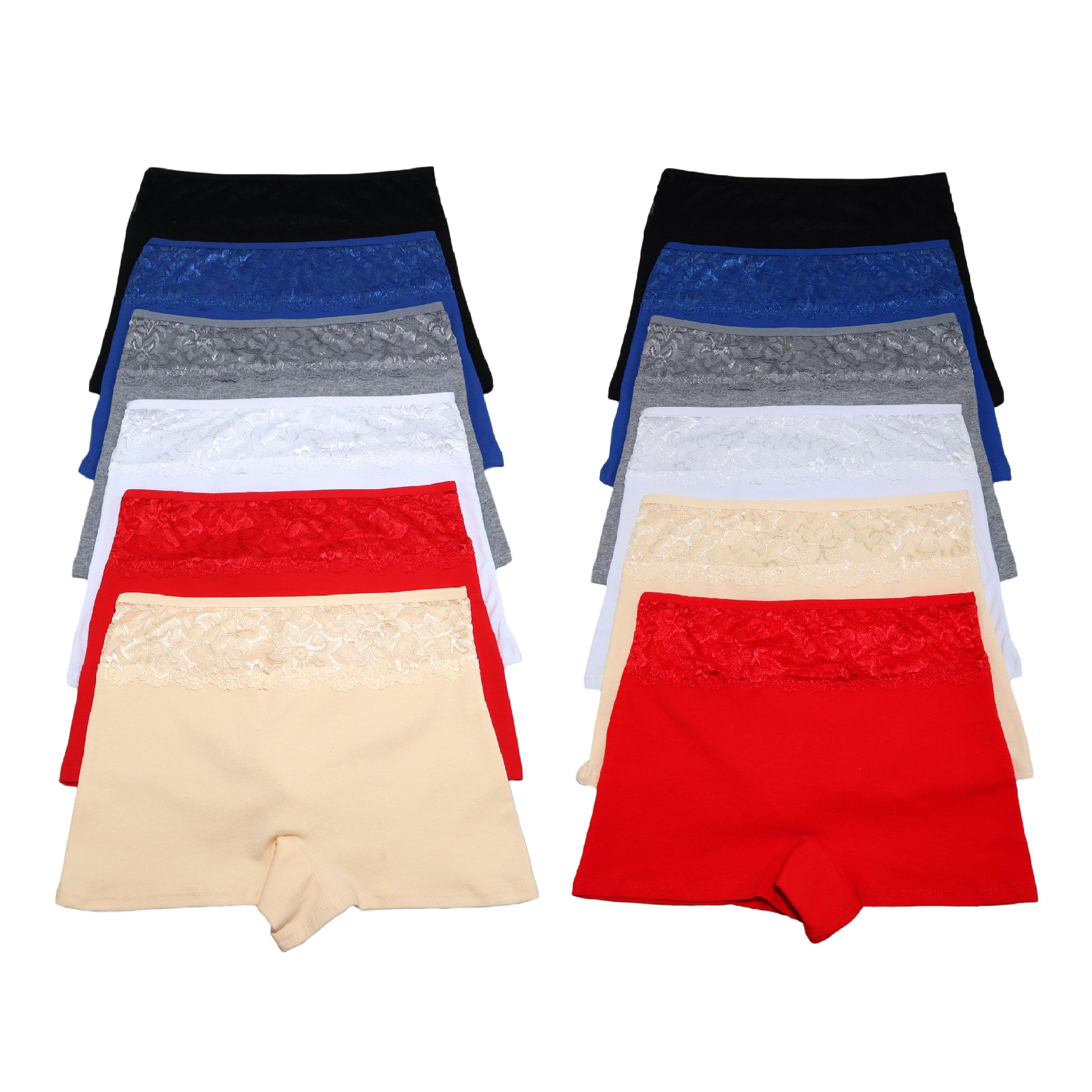 These classic boyshort boxer briefs feature an elegant lace accent design on the front waist. They are made with a soft, cotton gusset lining for maximum comfort. They provide full back and leg coverage for everyday wear. Available in a value pack bundle of assorted colors. General sizing guide corresponding to US pant size: Small (0-2), Medium (4-6), Large (8-10), X-Large (12-14). Made of 93% Cotton and 7% Spandex. Machine wash in lingerie laundry bag, line dry.