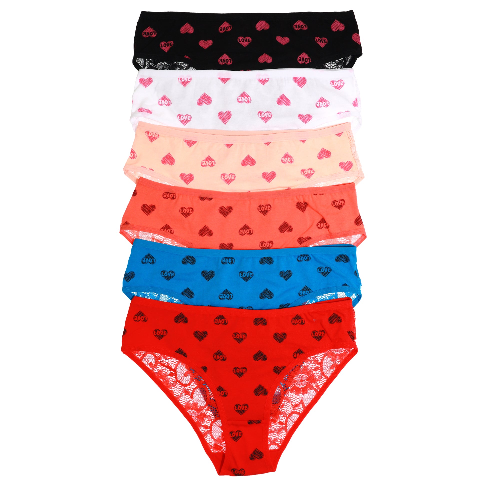 Cotton Bikini Panties with Heart Prints and Floral Lace Back (6-Pack)