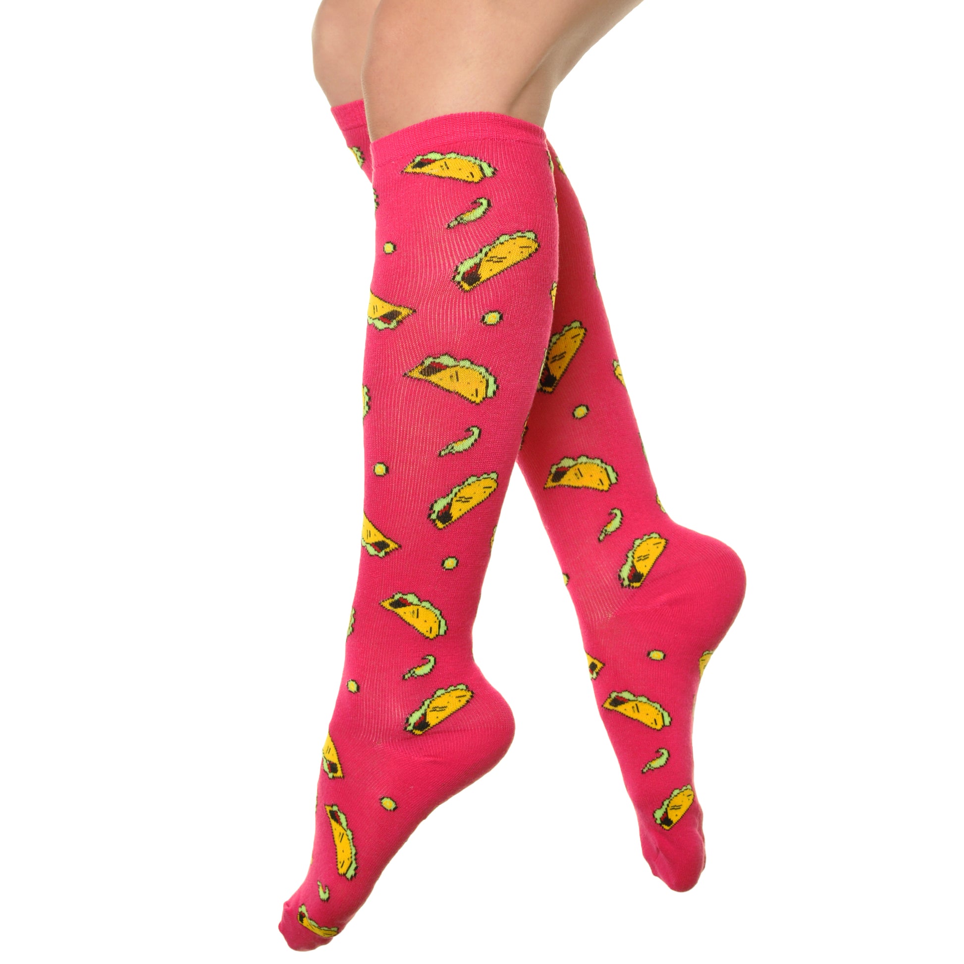 These novelty foodie socks are perfect for giving any boring outfit a fun pop of color and style. Mix-and-match these knee-high socks with boots or sneakers. They feature a comfort band at the top to keep them in place as well as a generous heel and toe for optimum comfort. Available in assorted colors and patterns. One size fits most. Made of 97% Polyester and 3% Spandex. Machine wash, tumble dry low.
