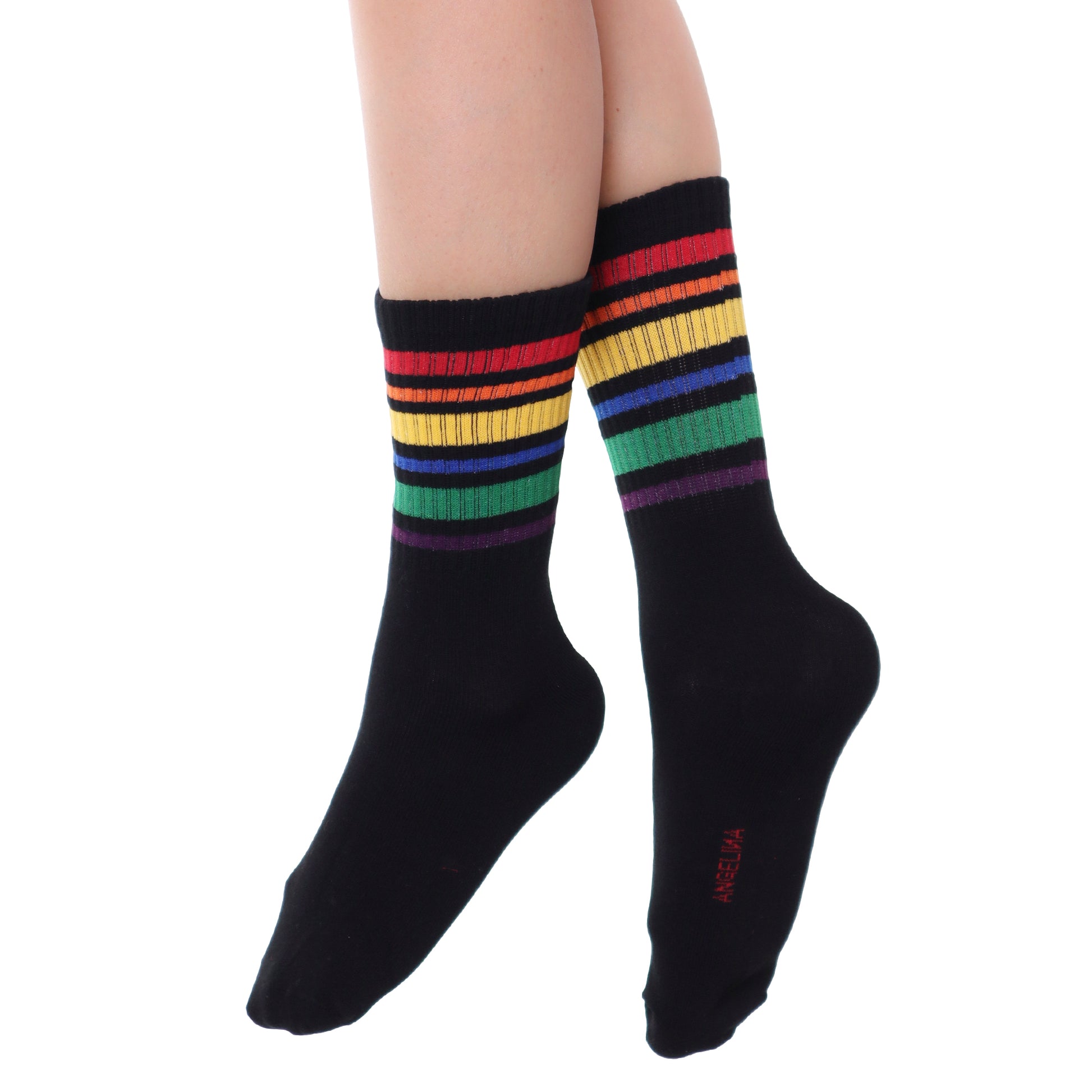 Make your outfit pop with these rainbow crew socks. They feature a rib knit comfort band at the top to keep the socks in place. The generous heel and toe construction provides optimum all day comfort. Wear them with boots or sneakers for any school, sports, costume, or casual everyday outfits. Available in a value pack bundle of assorted colors. Comes in big kid's shoe size 1-5 and women's one size fits most. Made of 77% Polyester, 20% Cotton, and 3% Spandex. Machine wash, tumble dry low.