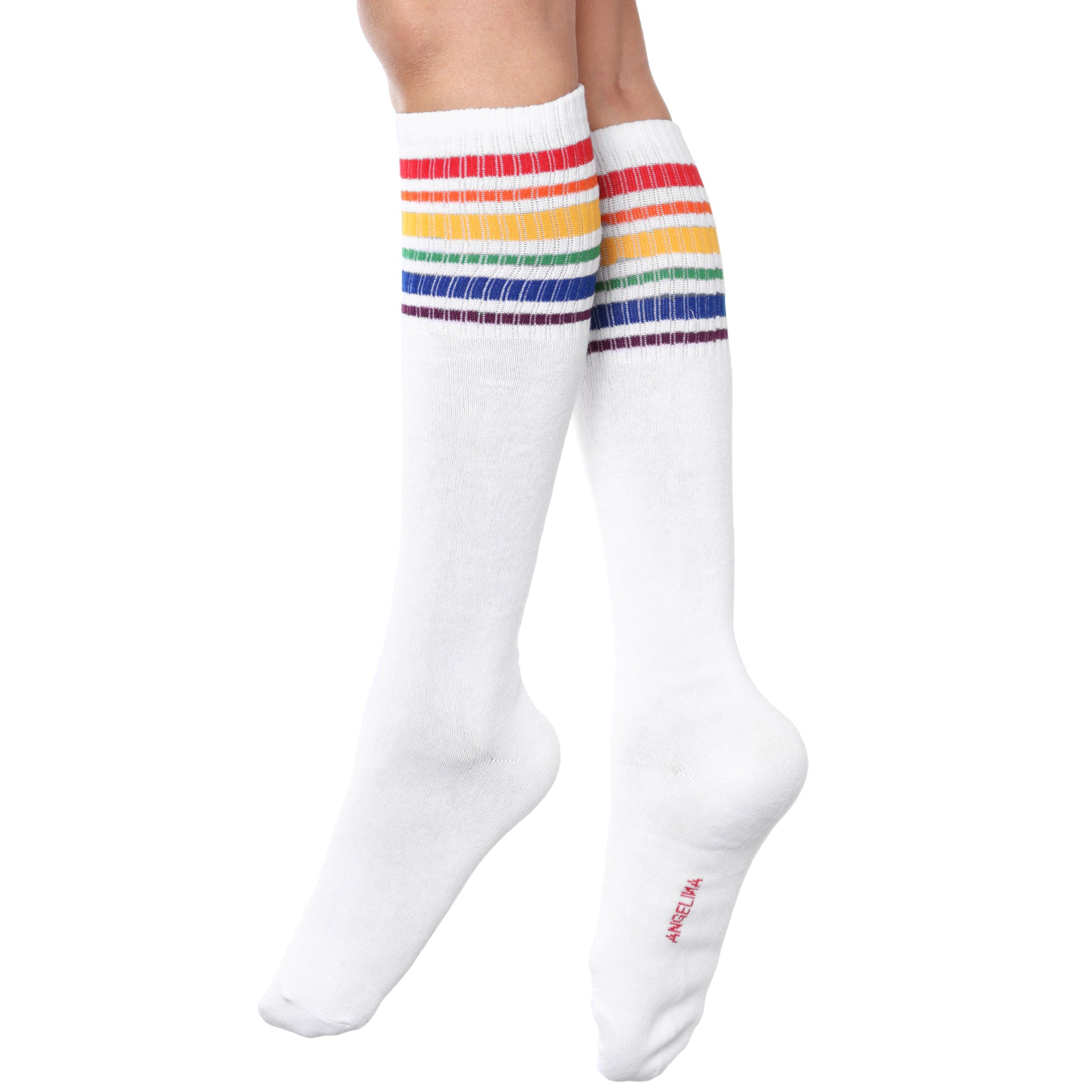 Make your outfit pop with these rainbow knee-high socks. They feature a rib knit comfort band at the top to keep them in place and provided optimum all day comfort. Wear them with boots or sneakers for any school, sports, costume, or casual everyday outfits. Available in a value pack bundle of assorted colors. Comes in big kid's shoe size 1-5 and women's one size fits most. Made of 77% Polyester, 20% Cotton, and 3% Spandex. Machine wash, tumble dry low.
