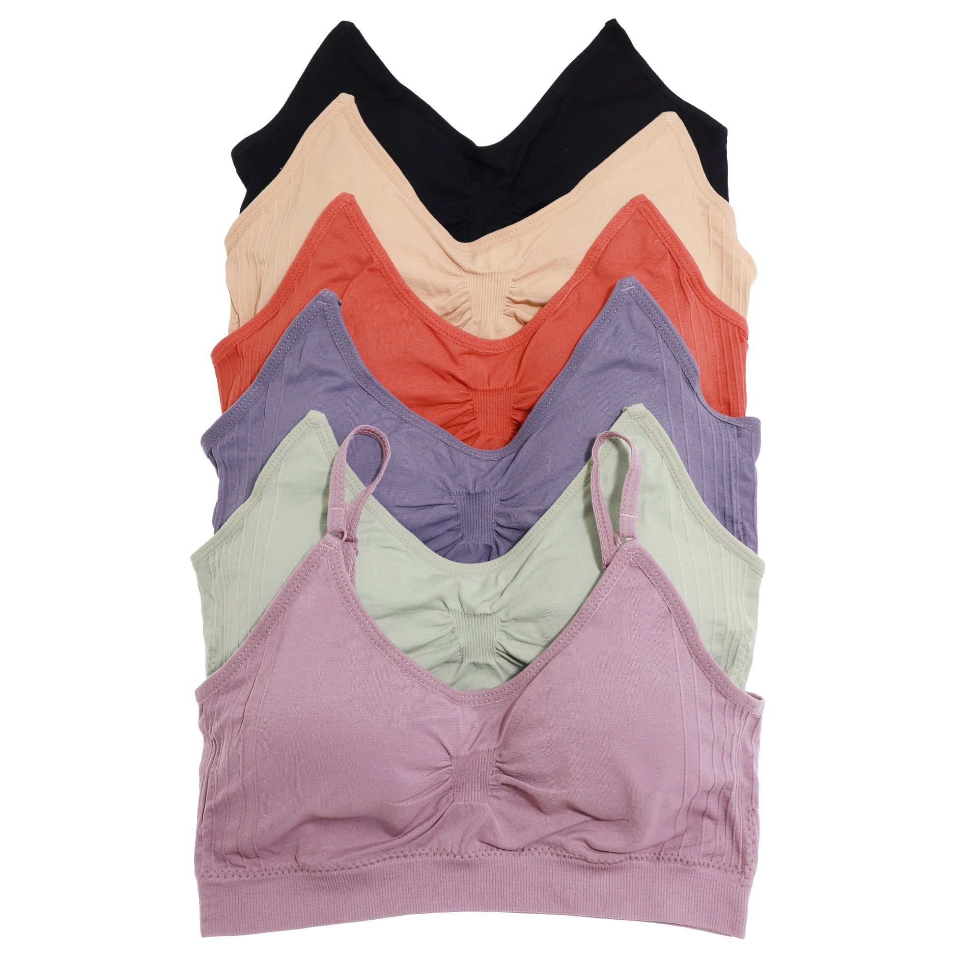 These matching classic bralettes and boyshorts feature a wire-free seamless design for maximum comfort. The bras have double layer pocket for removable pads or inserts and provide light-medium support for indoor sports, lounge and sleep. Matching bralettes and boyshorts sold separately Available in assorted colors. Comes in S/M and L/XL sizes. Made of 90% Nylon and 10% Spandex. Machine wash in lingerie laundry bag, line dry. For better results, hand wash.