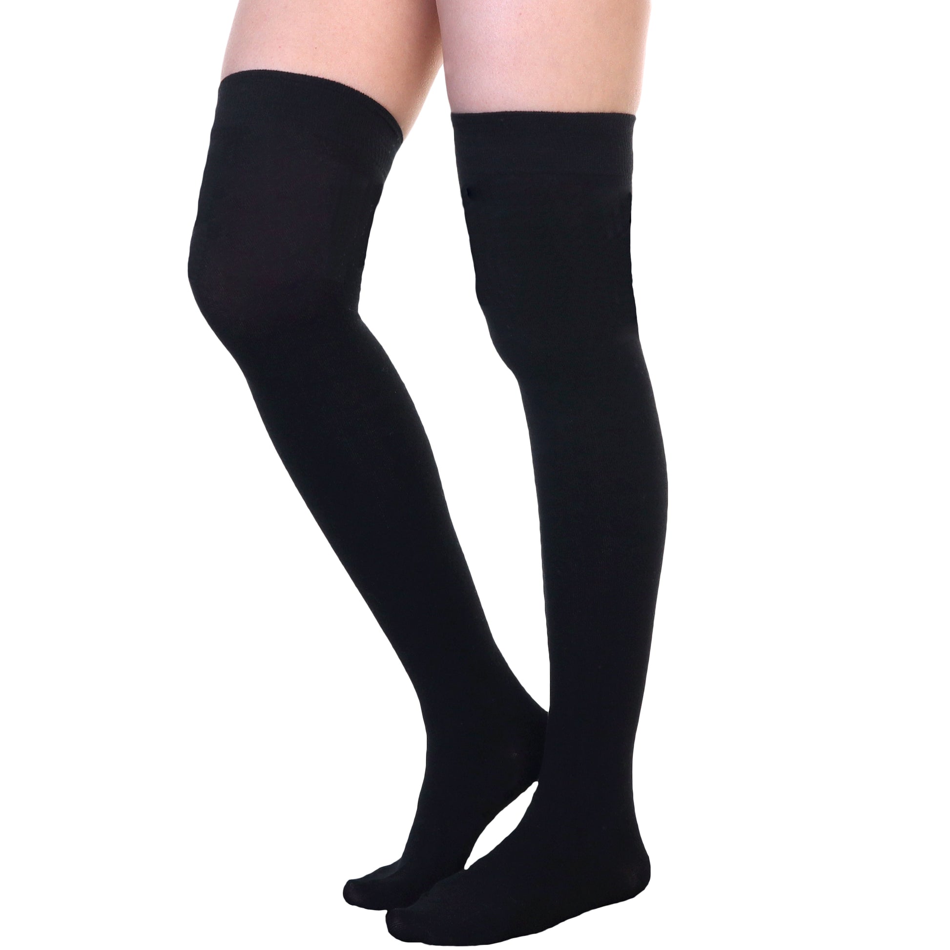These over the knee thigh-high socks feature a comfort band at the top to help keep the socks in place. They are ideal for sports, dancing, skating, parties, costumes, or casual everyday outfits. The generous heel and toe construction provides optimum comfort for all day wear. Available in a value pack bundle of all black or gray . One size fits most. Made of 77% Polyester, 20% Spandex, and 3% Spandex. Machine wash, tumble dry low.