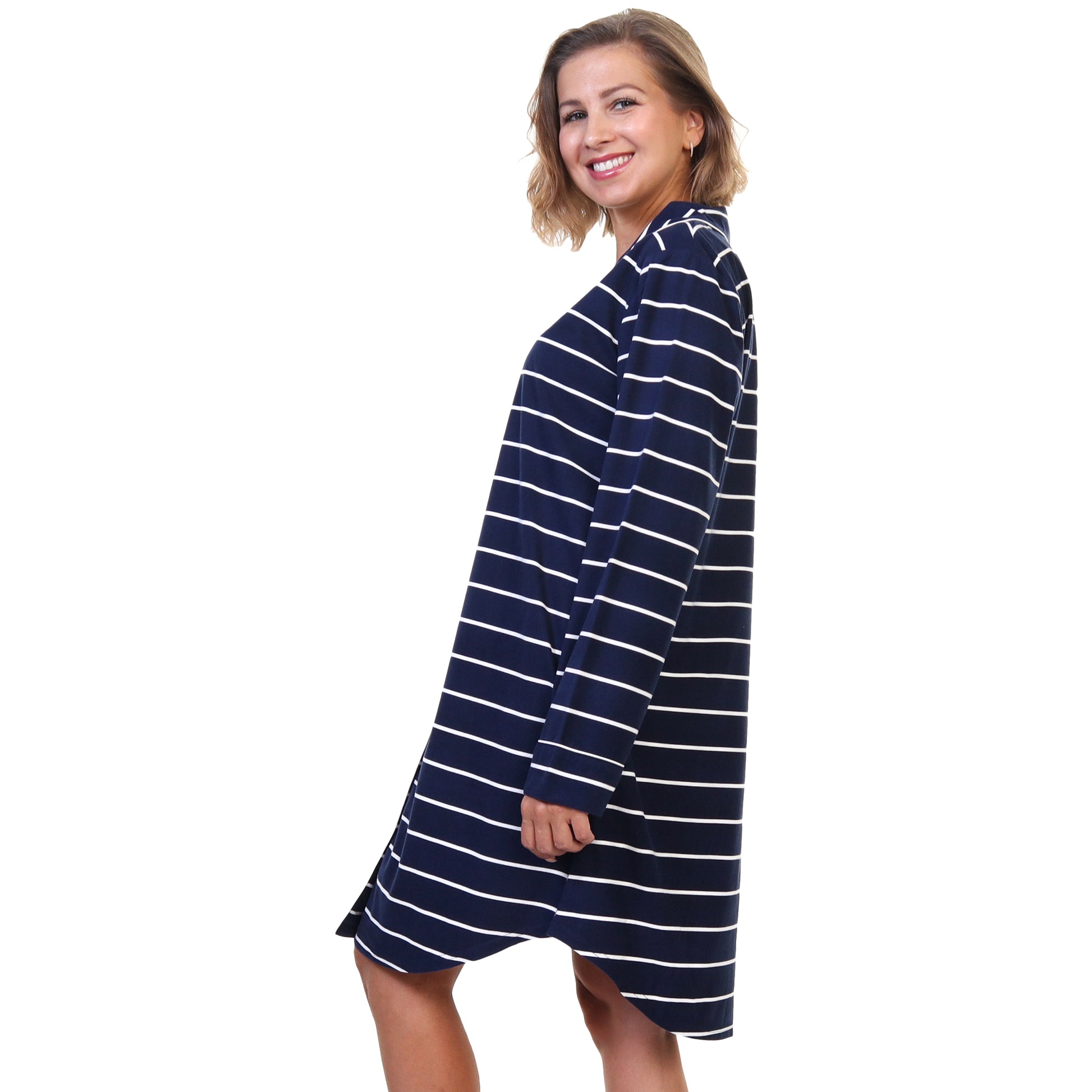 Relax in style with these women's flannel sleep shirt dresses that are perfect for wearing around the house as lounge wear or sleepwear. These pajama shirts feature a notched collar, contrast piping, and a front pocket. The relaxed boyfriend fit and ultra cozy flannel fabric provide all day comfort. Comes in sizes S, M, L, XL, 2X. Machine wash gentle cycle, line dry. For better results, hand wash.