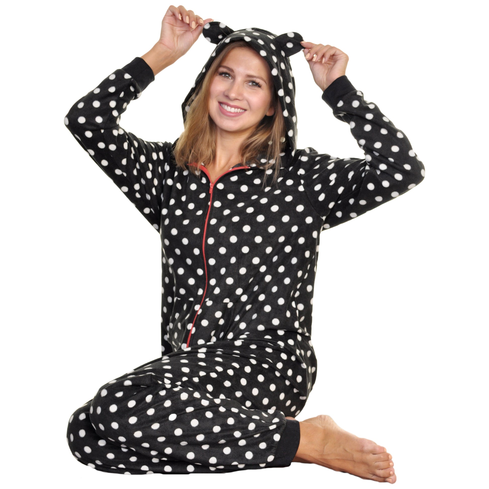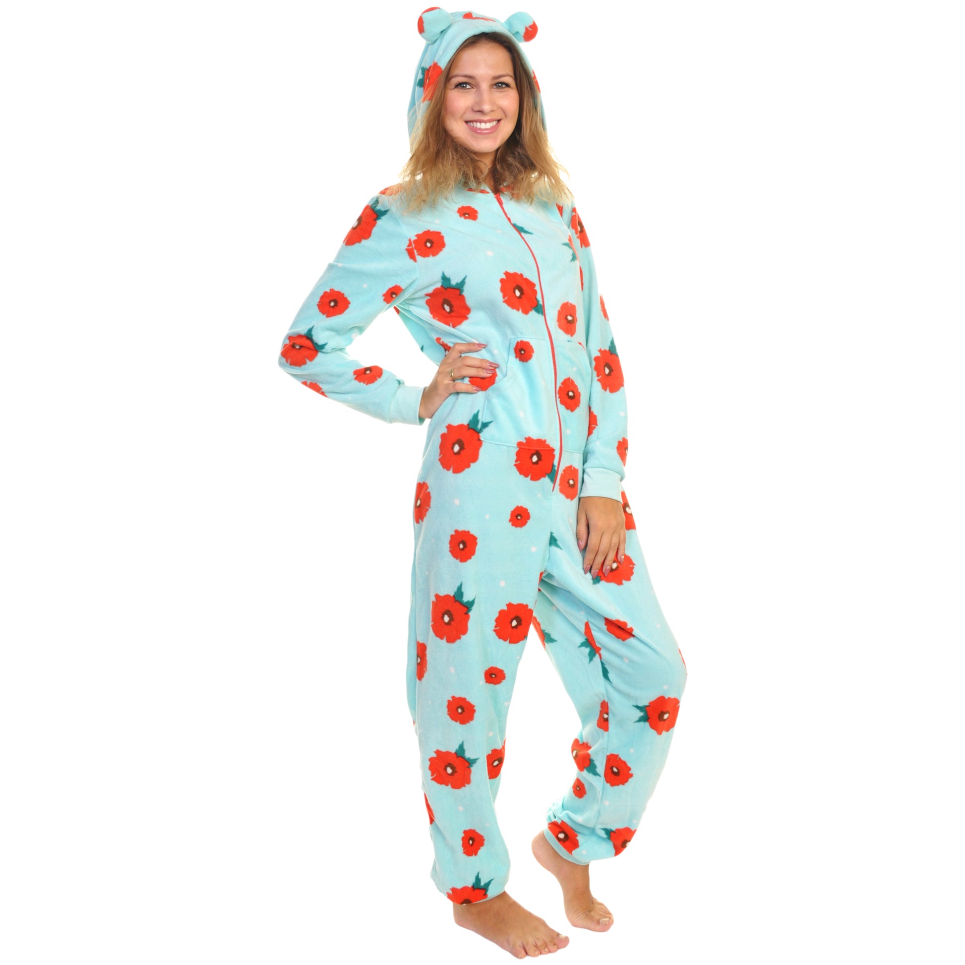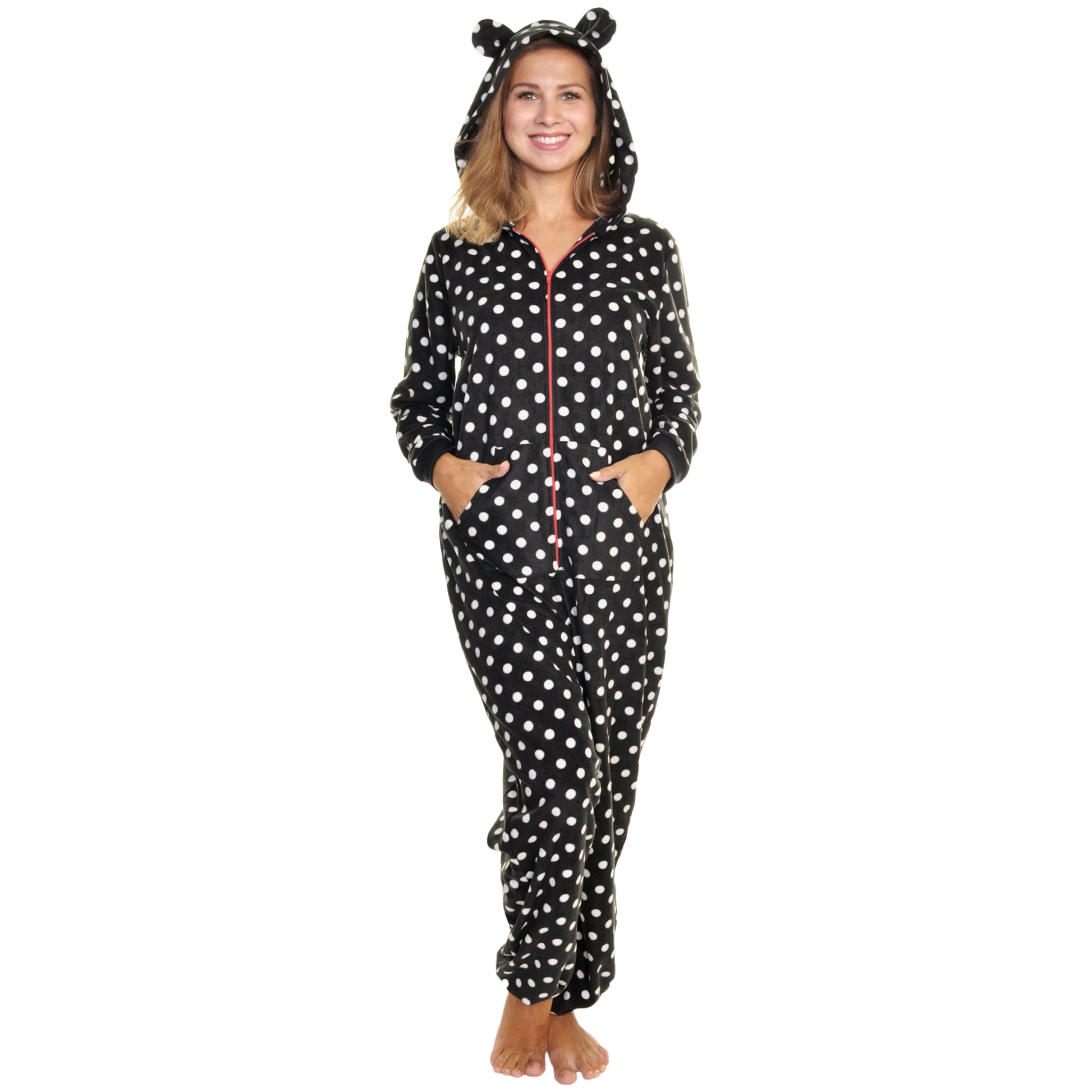 These FLEECE hooded novelty onesie pajamas have a front ZIPPER CLOSURE, rib knit cuffs, and CUTE animal ears on the hood. They also feature two front POCKETS perfect for carrying your phone or other small items. The soft FLEECE material makes them great for winter PAJAMAS or LOUNGEWEAR. Available in a VARIETY of COLORS and PATTERNS. Comes in Unisex S/M, L/XL, 1X/2X, and 3X/4X . Made of 100% Polyester. Machine wash, tumble dry low.
