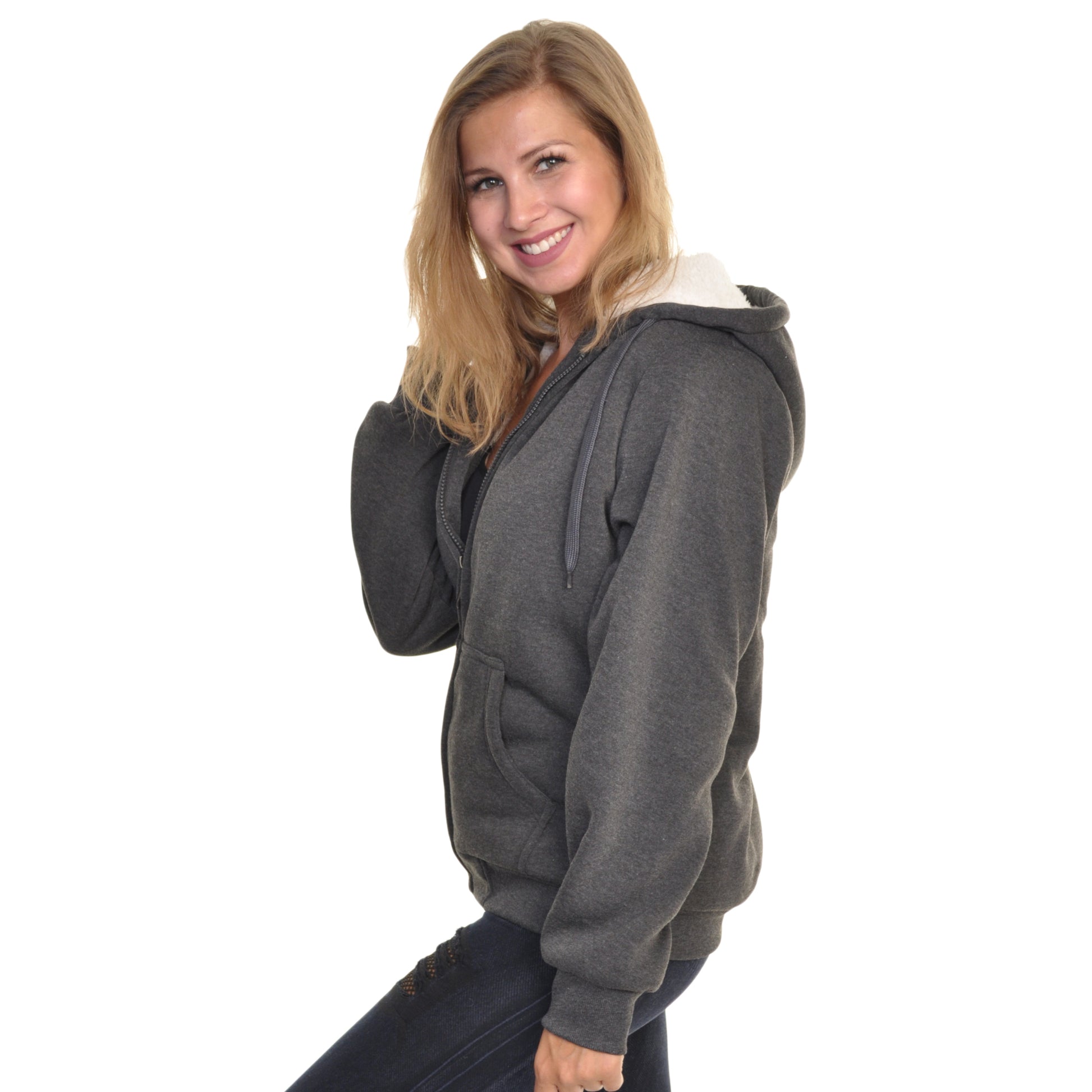 These women's sherpa-lined hoodies come with drawstring at hood, split kangaroo front pockets, full zipper closure, and rib knit cuffs and waistband. The hood and body areas are heavily lined with winter-weight faux sherpa; while the sleeves are lightly lined for the ease of movement. Available in assorted colors, from size Small to 3XL. Made of 100% Polyester. Machine wash gentle cycle, line dry.